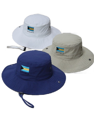 RR FLAG BUCKET HAT WITH CHIN CORD IN WHITE, NAVY AND BEIGE WITH FLAG DESIGN WITH UPF