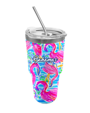TUMBLER S/STEEL 30oz WITH STRAW AND PAINTED FLAMINGO DESIGN